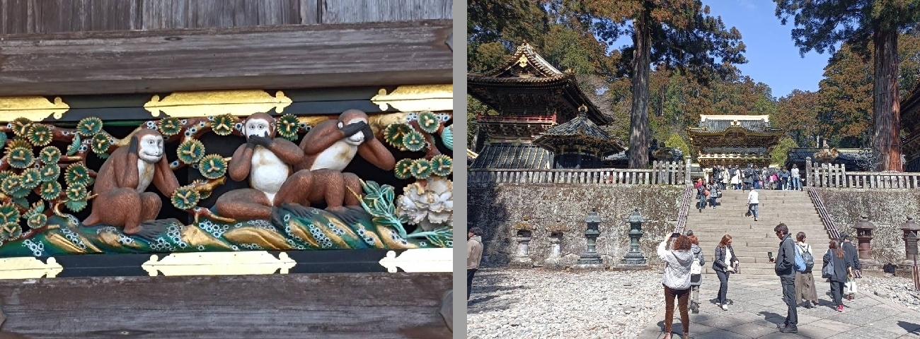見ざる聞かざる言わざるのお猿さんを見て、なんかなぁ〜思い当たることがあるような?この場所、半世紀前の修学旅行で記念写真を撮った場所ですね!