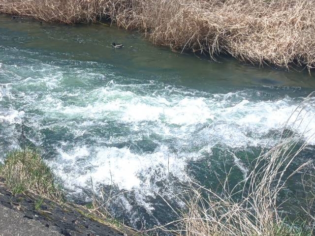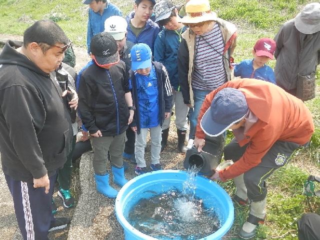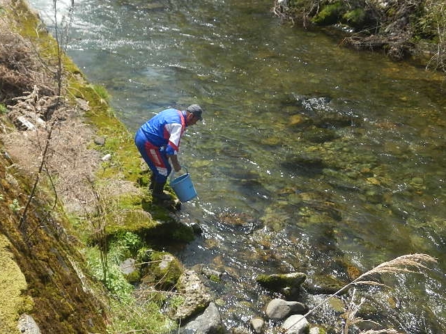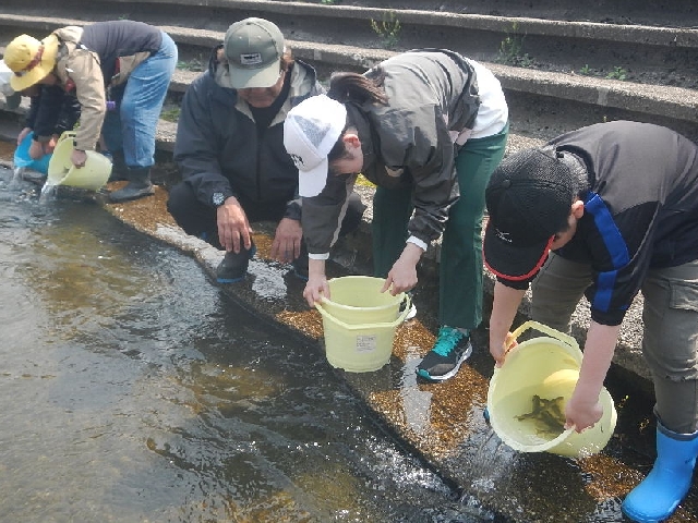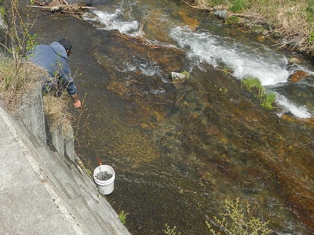 先ずは根田茂川からのスタート!バケツで5kgづつ数か所にコマク分散してカワウに食べられない様・・・