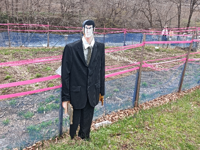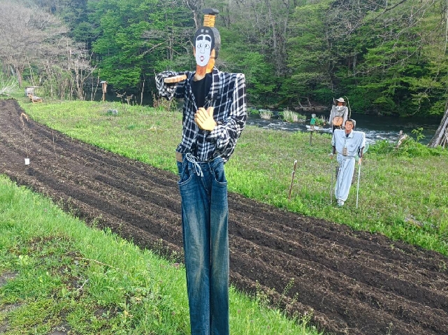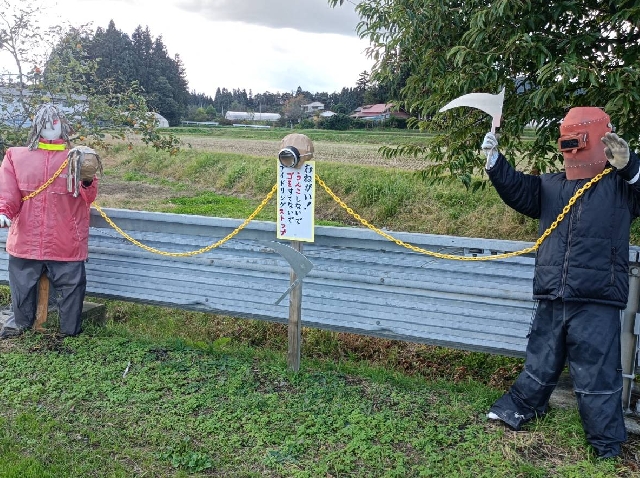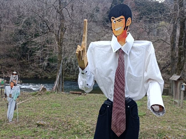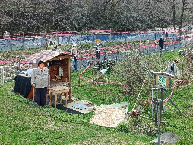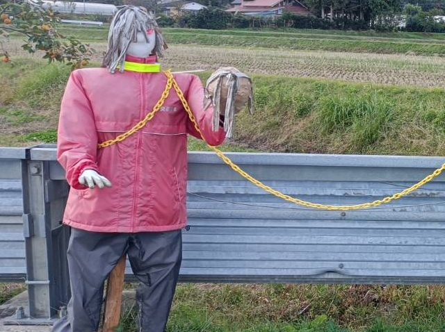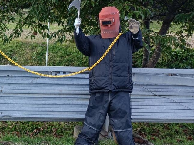 簗川の監視活動にいったら、案山子が増えていました。この中にゴルゴ13が2人います。さあ〜どこでしょうか?
