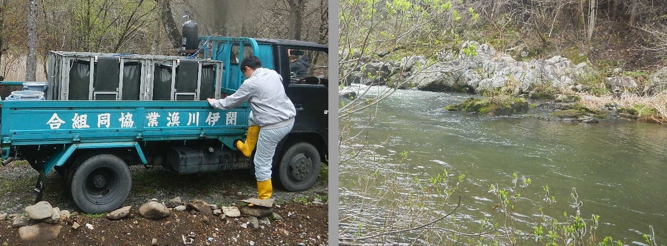 今日は山女魚の放流・・・閉伊川漁協から100kg+オマケ分?kgを仕入れ、簗川、根田茂川に放流です。