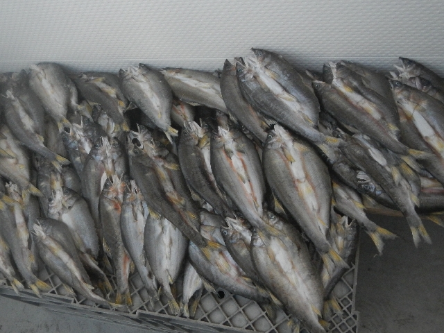 イイ感じに出来上がりました。案の定、野良猫が魚干し網を破って3切れ食べてました。