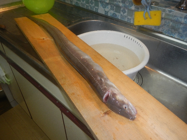 サバのアラを入れて沈めて置いたカゴに90cmの穴子・・・getです。蒲焼き何人前出来るでしょうか?