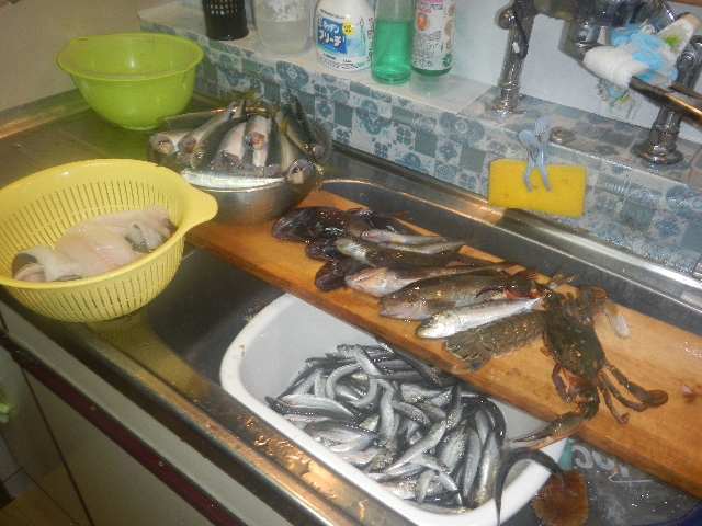 2人合わせてこんな感じ・・・サバ、穴子、イワシ、どんこ、クジメ、ハゼ、カニ、シャコ、さぁ〜これからの下処理が大変・・・