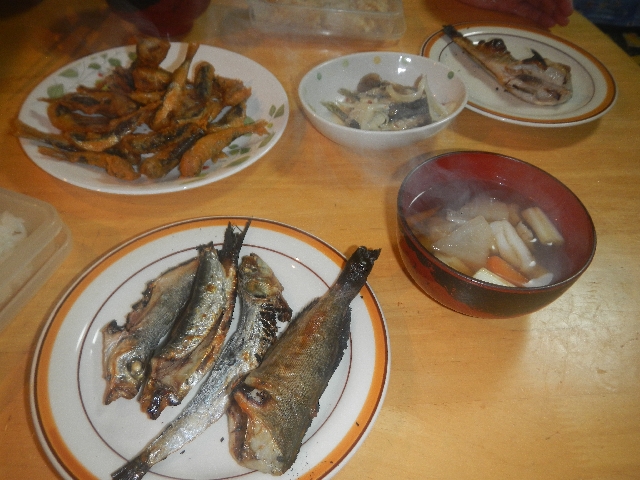 イワシは唐揚げと南蛮漬けに…どんこは澄し汁、クジメは塩焼き、イシガニは蒸して、今晩の夕飯のおかずが出来上がりました。