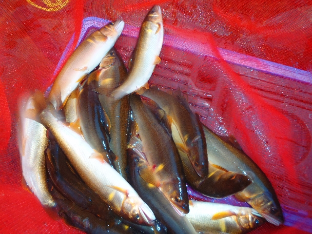 閉伊川漁協から岩魚80kg仕入れての放流・・・1尾10g〜15gちょうどいいサイズです。今日は上流根田茂川と簗川本流に放流です。