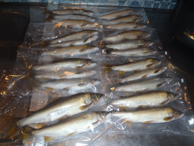 今年の鮎冷凍庫から出して解凍・・・干物造りです。