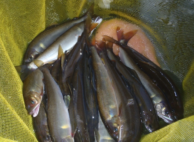 そして根掛かり6時迄アタリ無し・・・ヨレヨレのオトリで諦めかけた午後6時やっと1匹getそれからの30分で良型7連チャン諦めなくて良かった〜ぁ!暗くなってきたので今日はおしまい。