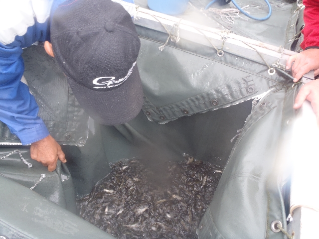 孵化槽を掃除して残った岩魚30kgを一旦孵化槽に入れて置き後は各自鮎オトリ缶に入れて分散して放流します。