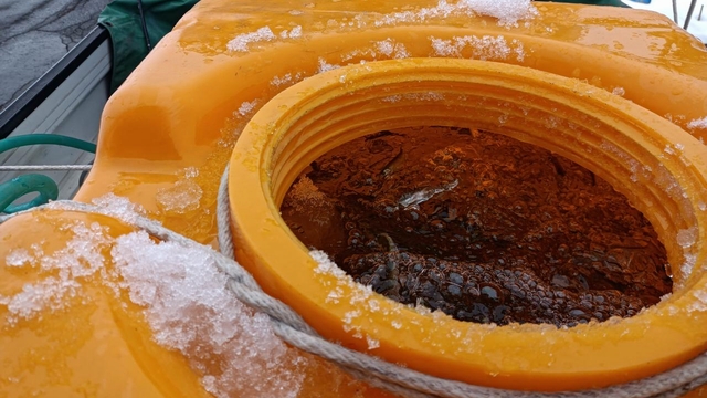 先ずは水槽に氷を入れて川の水と水温を合わせます。水槽は井戸水で15℃川の水は3℃です。