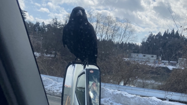 カラスがミラーに乗っておやつをおねだりしています。鶏の唐揚げをチョットあげたら美味しそうに食べていたけれど・・・ねえカラスさん・・共喰いですよ!