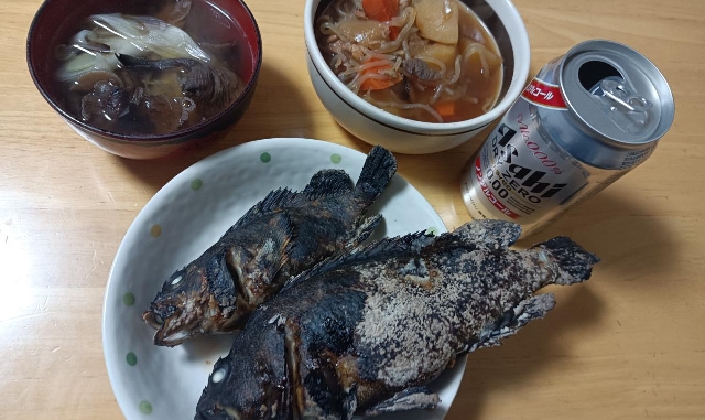 昨日の魚釣りは(ボ)頂いたソイを塩焼きでうんめがった〜!