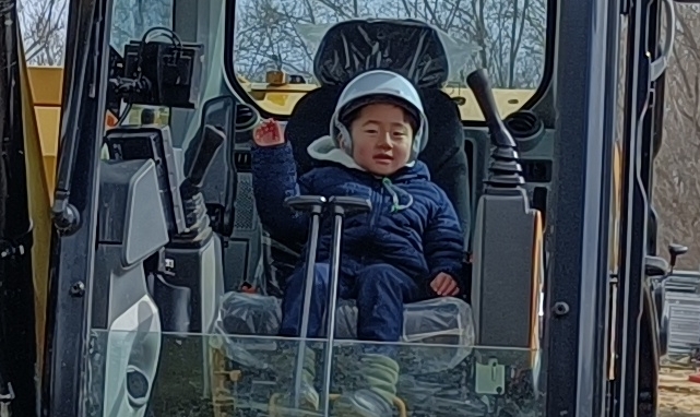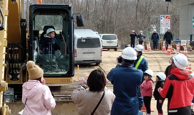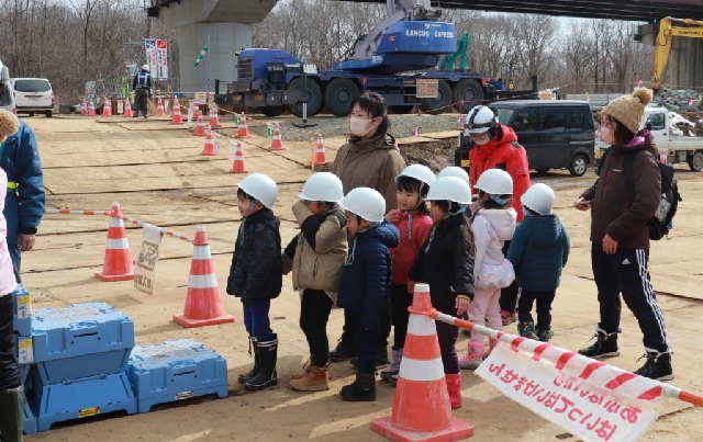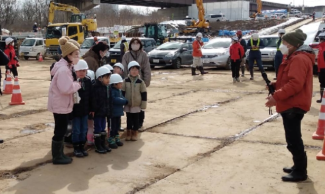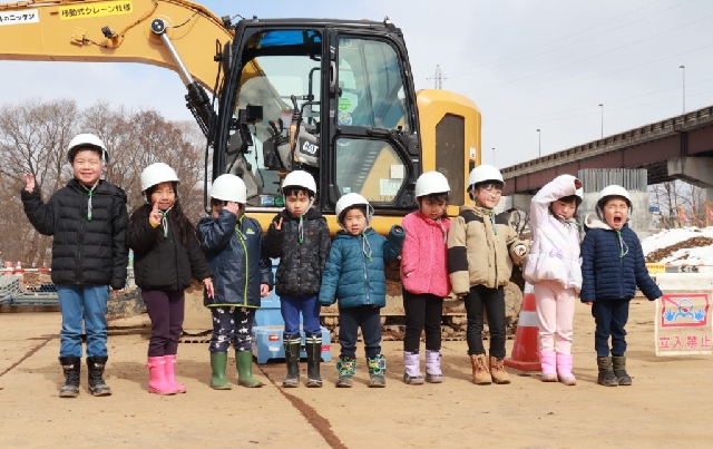 建設現場ですので子供達は安全にヘルメットをかぶってますね。