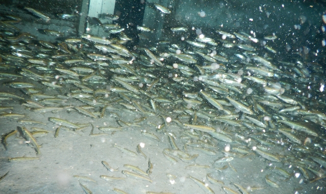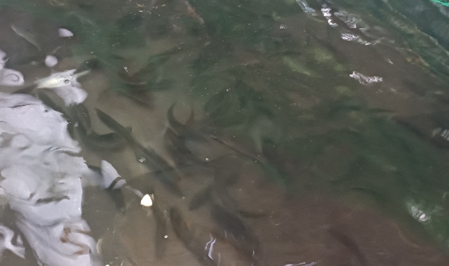 水槽の中の鮭・・・鮭稚魚大きくなって窮屈そうです。