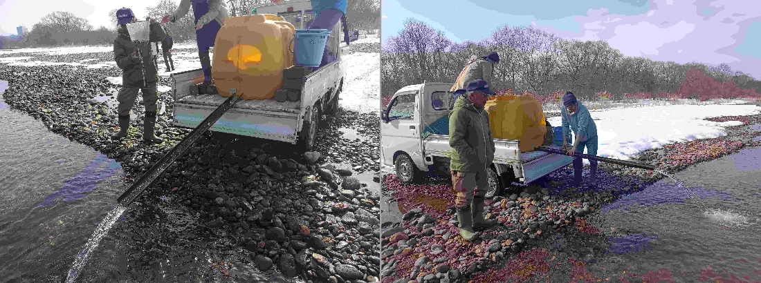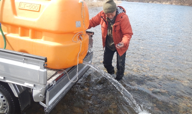 今日は雫石川に鮭稚魚放流・・・北海道産2万匹です。