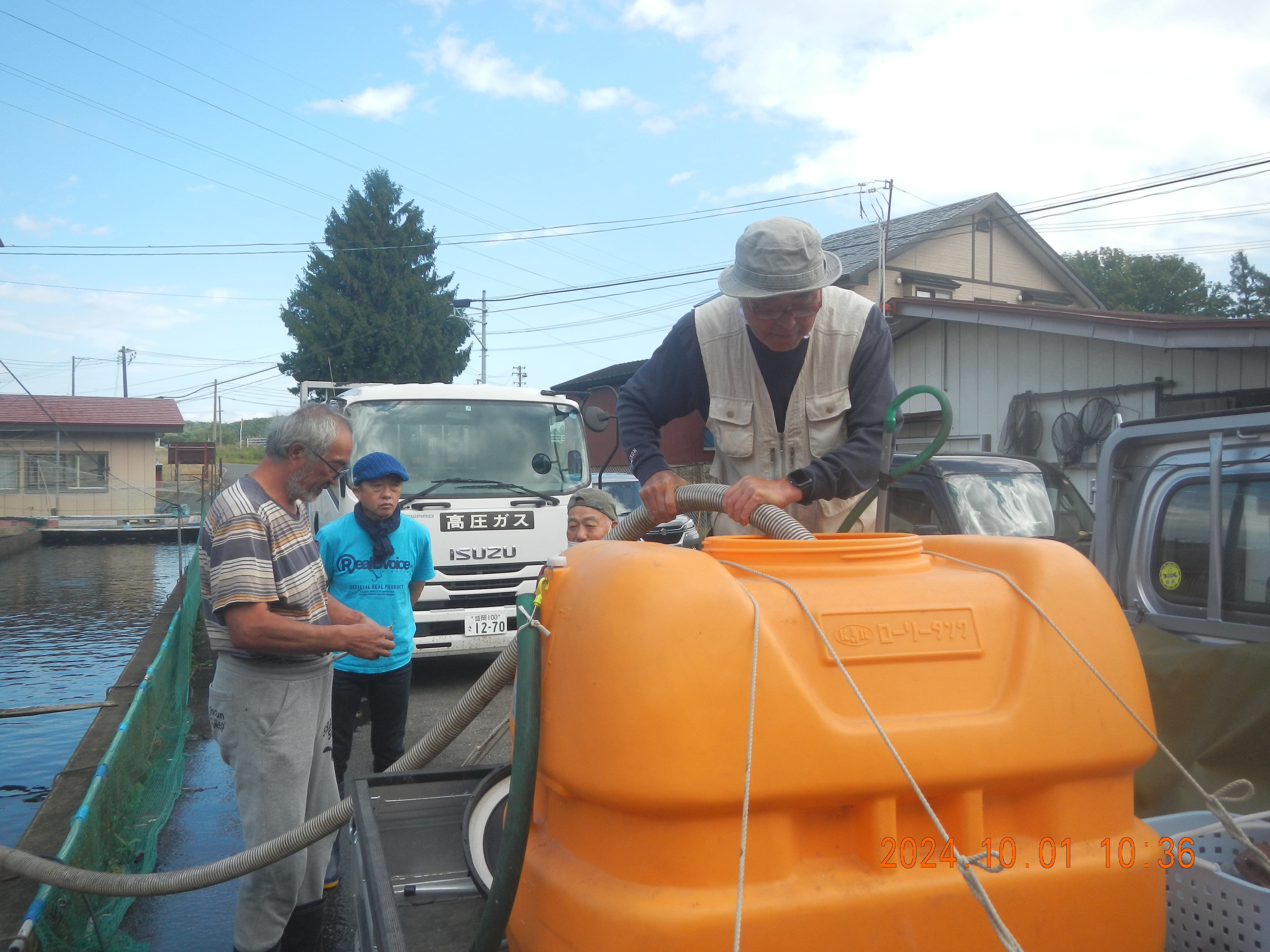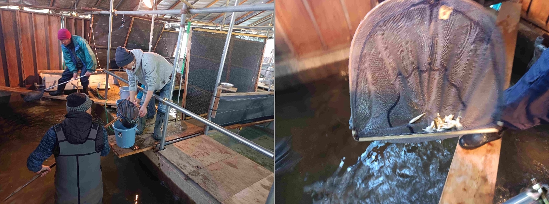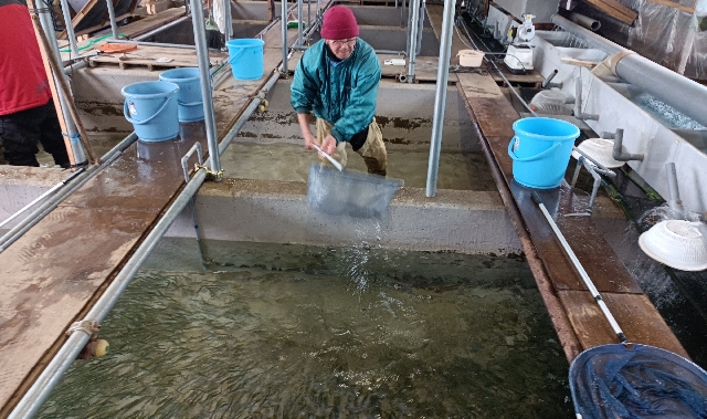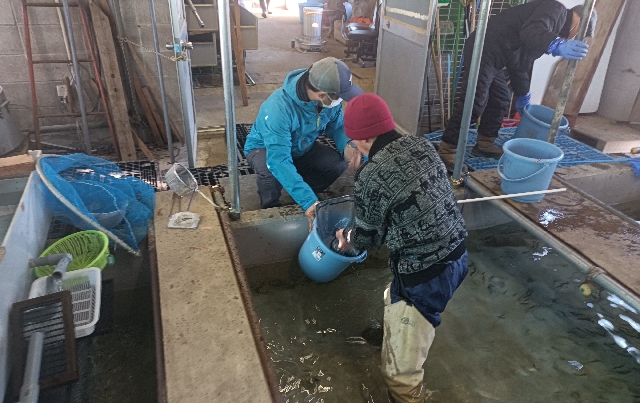 孵化場での作業・・・水槽から稚魚を取り出しバケツでタンクまで運びます。