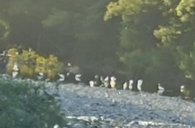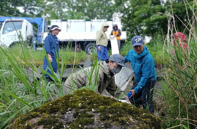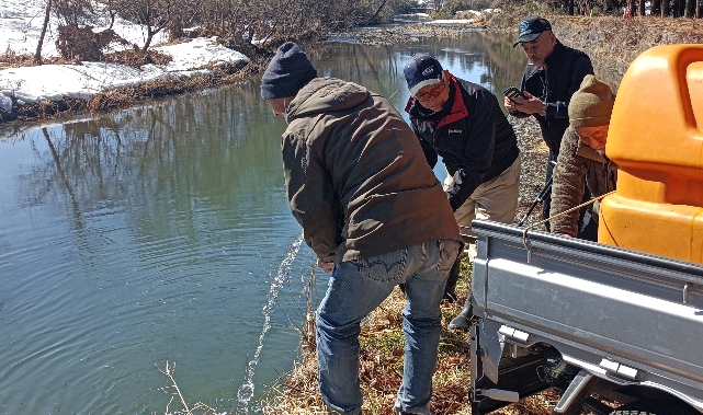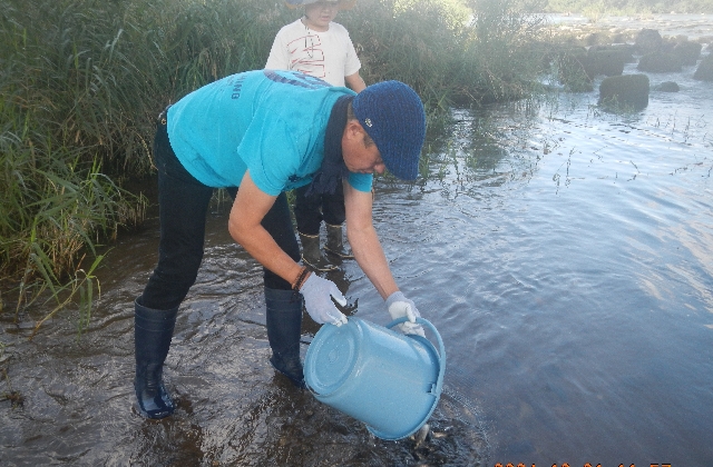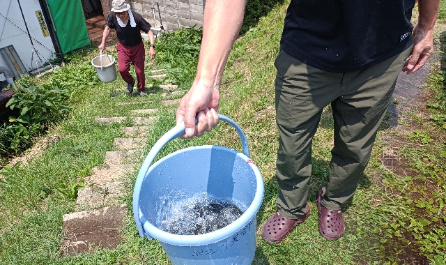 カワウ被害対策・・・バケツを使って細かく分散して数ヶ所に放流します。