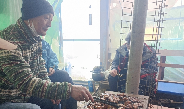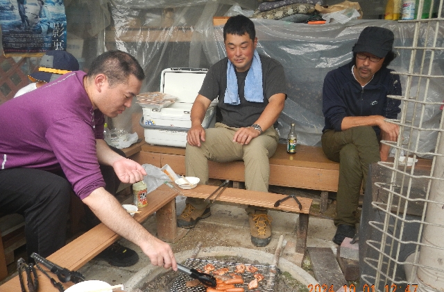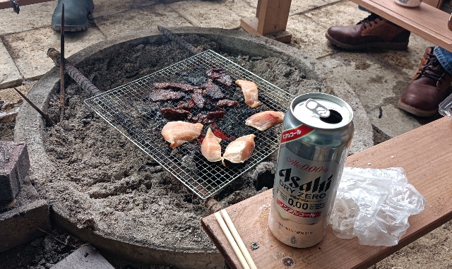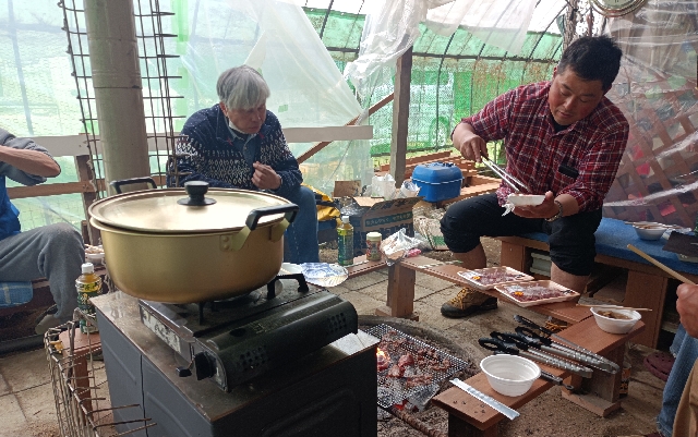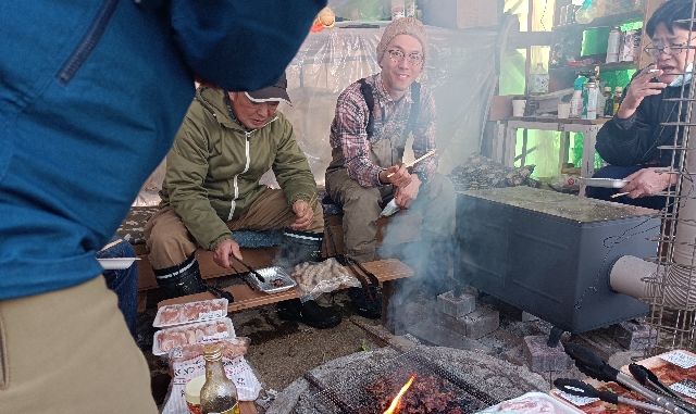 放流終了後はいつもの様に囲炉裏を囲んで焼肉・・・釣り談義・・・釣り自慢話・・・?!