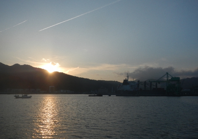 釜石港、西の空に夕日が沈みます。今日はこれでおしまい・・・・