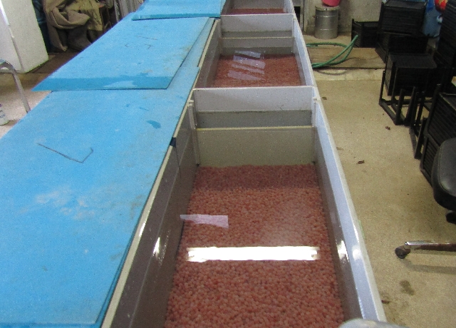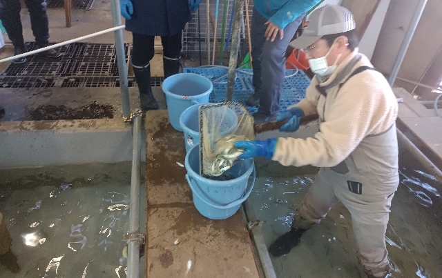 漁協に持ち帰り一旦孵化槽に入れ仕分けします。さあ!これからの作業が大変です。