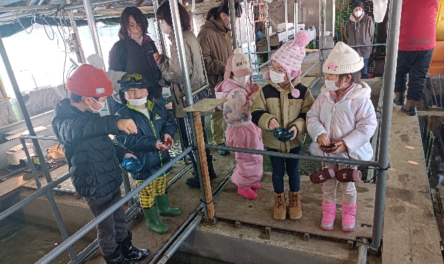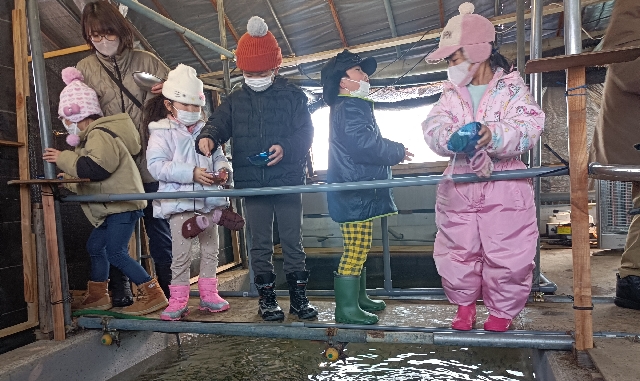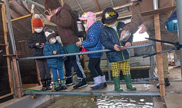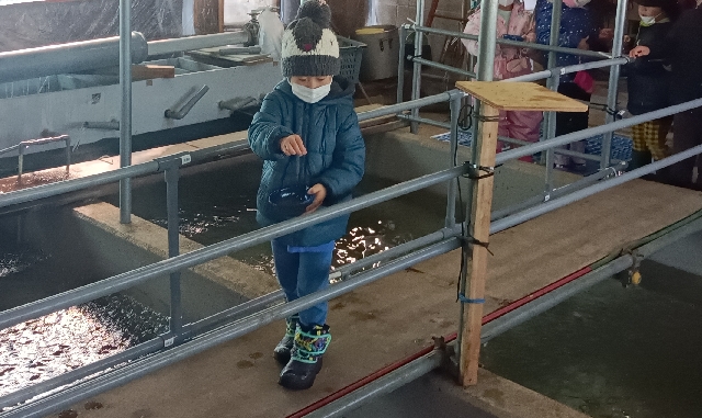 今日は太田保育園の園児が鮭稚魚への餌やり体験にやって来ました。