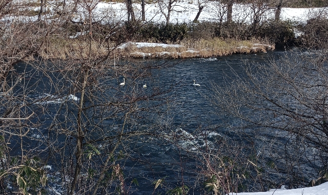 晴天朝日が綺麗です。そして家の前の北上川では白鳥が遊んでいます。