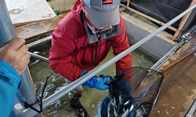 水槽から鮭稚魚をすくう作業・・・これも又大変な作業です。