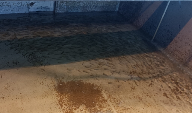 そしてバケツで運びます…タンクの中は鮭稚魚でびっしりと!