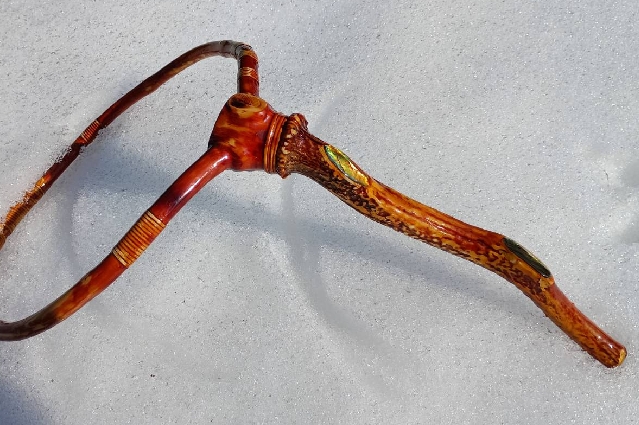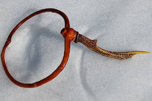 お客様に依頼され制作した渓流タモ・・カヤの木で鹿の角と螺鈿を使用カシュ―透きで仕上げ・・・